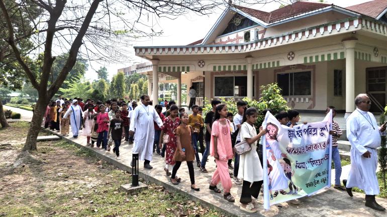 তোমরা যখন শোভাযাত্রা করে ক্রুশ হাতে নিয়ে সামনের দিকে এগিয়ে যাও তখন তোমরা যীশুকে বহন করো। তোমরা তার পাশে মোমবাতি দিয়ে আলো করে রাখো,” বলেন ফাদার জেমস।