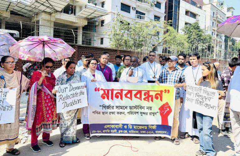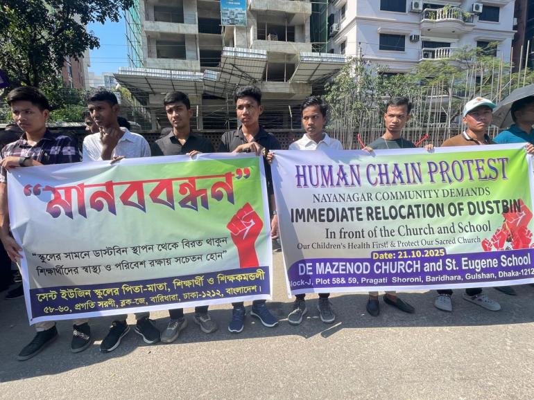আজ ২১ অক্টোবর ২০২৫ খ্রিস্টাব্দে, নয়ানগর এলাকার ডি’ মাজেনড গির্জা ও সেন্ট ইউজিন স্কুলের সামনে আবর্জনার ডিপো নির্মাণের বিরুদ্ধে খ্রীষ্টান সম্প্রদায়সহ সচেতন নাগরিকদের উদ্যোগে আজ একটি শান্তিপূর্ণ মানববন্ধন অনুষ্ঠিত হয়েছে।
