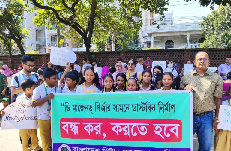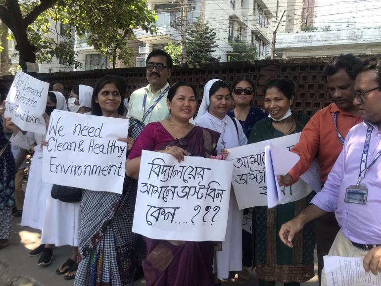 নয়ানগরে ডি’ মাজেনড গির্জা ও সেন্ট ইউজিন স্কুলের সামনে ডাস্টবিন নির্মাণের প্রতিবাদে মানববন্ধন