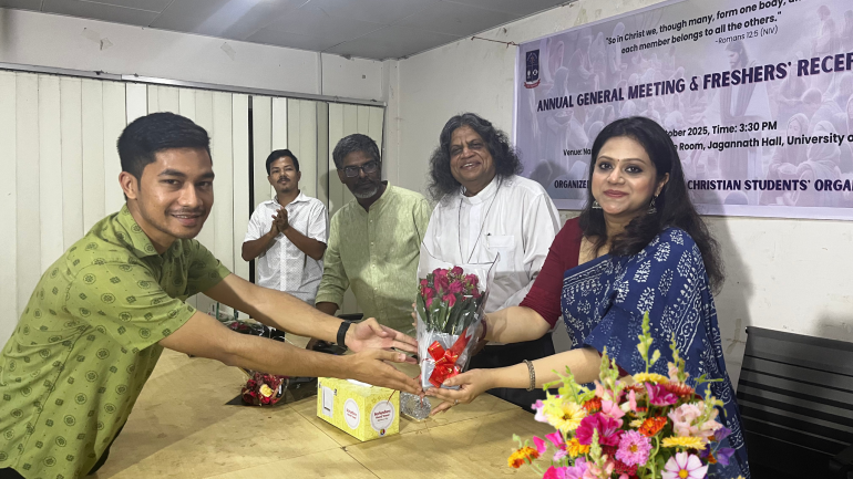গত ৩১ অক্টোবর ২০২৫ খ্রিস্টাব্দ, ঢাকা বিশ্ববিদ্যালয়ের জগন্নাথ হলের নরেশ চন্দ্র সেনগুপ্ত কনফারেন্স রুমে অনুষ্ঠিত হলো ঐক্যের আলোয় নবীনদের বরণ অনুষ্ঠান।